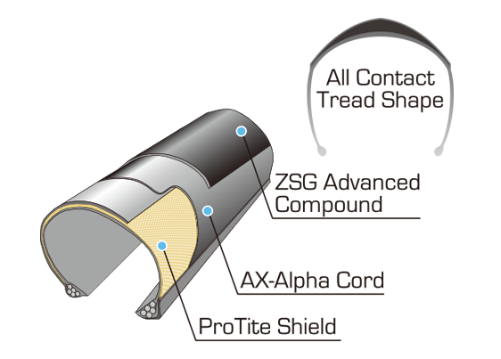 ยางอเนกประสงค์ที่เหมาะสำหรับทุกสภาวะ ใช้สำหรับการแข่งขันและฝึกซ้อม อัตราส่วนความแข็งแรงต่อน้ำหนักที่ยอดเยี่ยมและ ZSG Dual Compound ทำให้ยางรุ่นนี้เหมาะสำหรับการใช้งานอเนกประสงค์ Protite Shield แบบเอกสิทธิ์เฉพาะแบบ Bead-to-bead เพื่อการป้องกันการเจาะและการบีบขั้นสุด AX-Alpha Cord ที่ละเอียดมากเป็นส่วนผสมที่ลงตัวระหว่างความนุ่มนวลและความทนทาน เพื่อช่วยป้องกันการหนีบและการบาดที่แก้มยาง